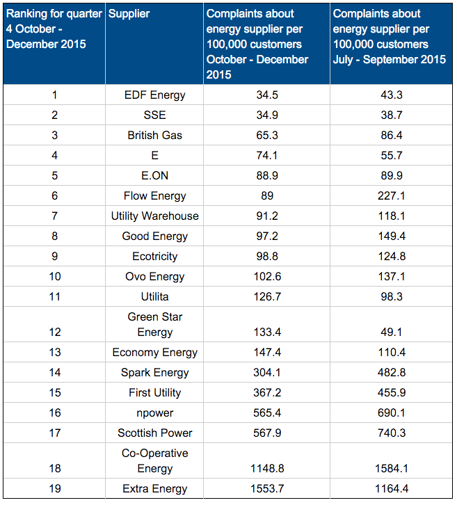 EDF Energy clinching the top spot for October to December 2015 by just 0.4 points, pushing out SSE who had been number one since the table was first published in its current format nearly five years ago.