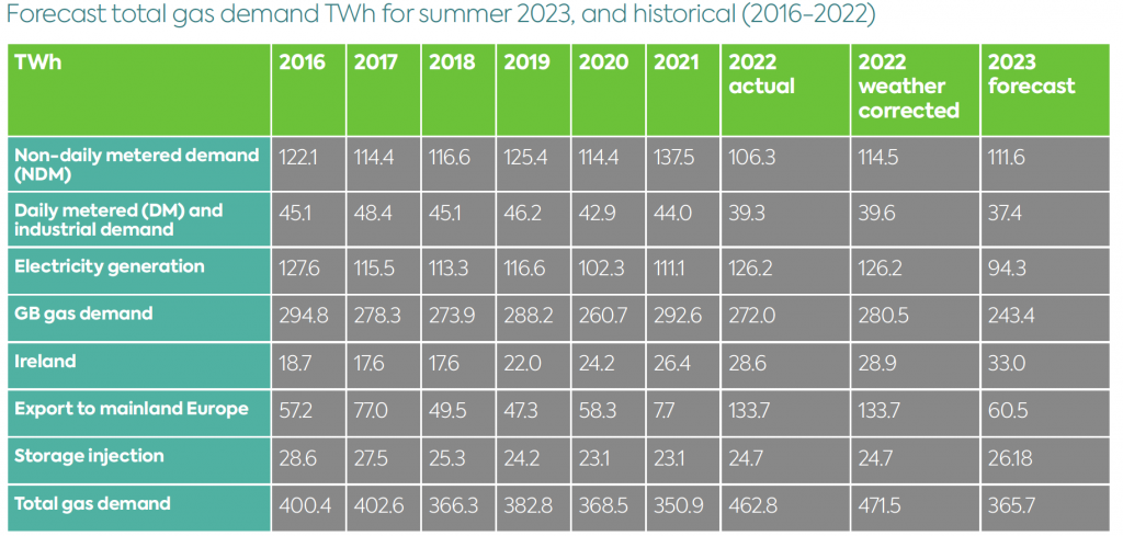 The summer outlook for the gas transmission network is likely to see a fall-off in gas transiting GB to be injected into the European network – a major feature of the summer in 2022 as European countries tried to fill gas storage facilities before the winter, without access to Russian pipeline gas. Jake Tudge, corporate affairs director at the National Gas Transmission said, “It’s difficult to articulate the significant efforts to re-configure our network over the past year to support exports to Europe – it has been a colossal effort by teams across National Gas and the industry.” He added, “We exported three times as much gas to Europe last summer (about 12 billion cubic meters) compared to a usual summer of 4bcm.”